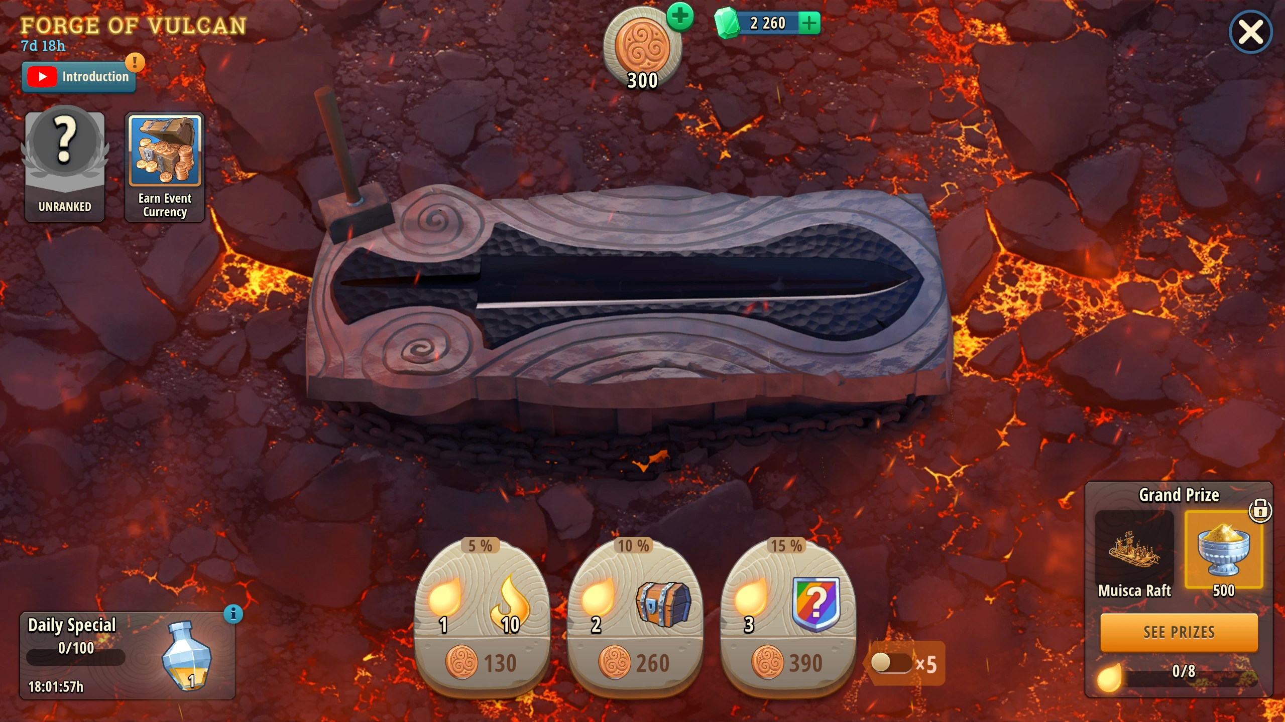 The Forge of Vulcan 2026 features the chest mechanic, where the objective is to open one of the three chests, each containing different rewards. After tapping the event banner, you will visit the main event window: